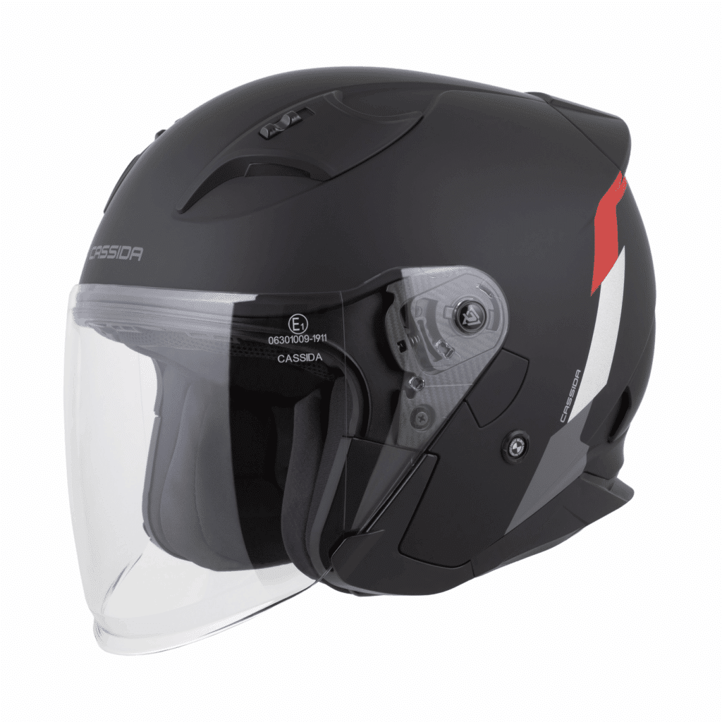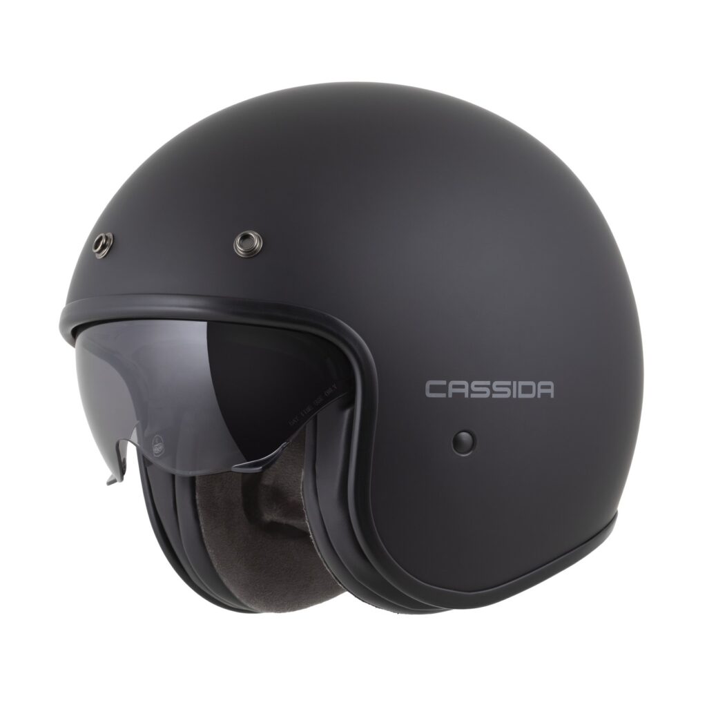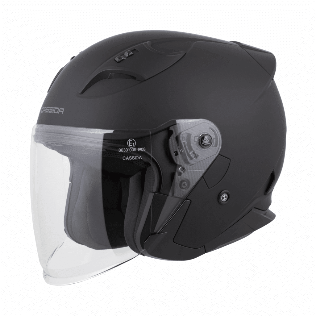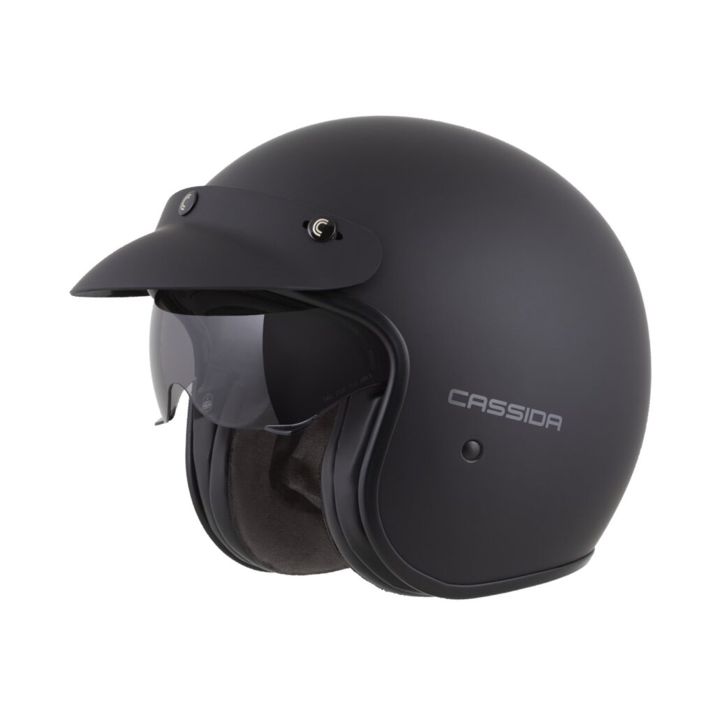 Otvorená jet prilba Cassida: Polykarbonátová škrupina Dlhé plexi s úpravou proti zahmlievaniu Slnečná clona Ventilačný systém s uzamykateľnými krytmi ventilačných
