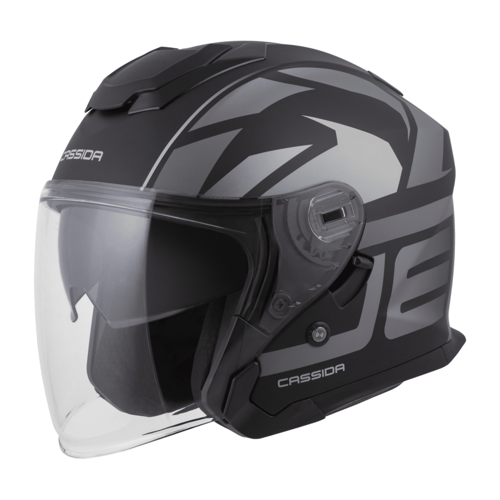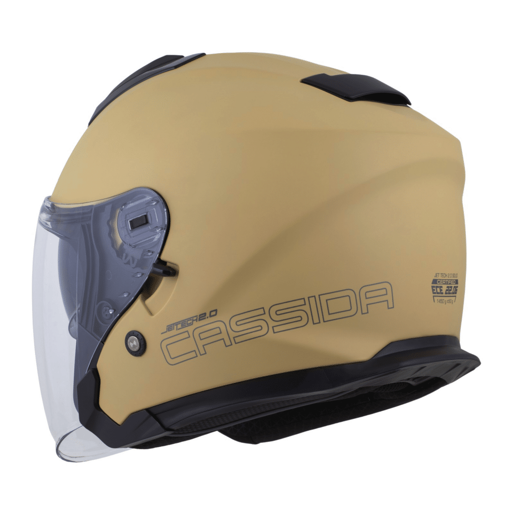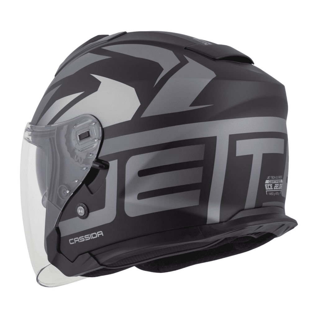 Otvorená jet prilba Cassida: Polykarbonátová škrupina Dlhé plexi s úpravou proti zahmlievaniu Slnečná clona Ventilačný systém s uzamykateľnými krytmi ventilačných